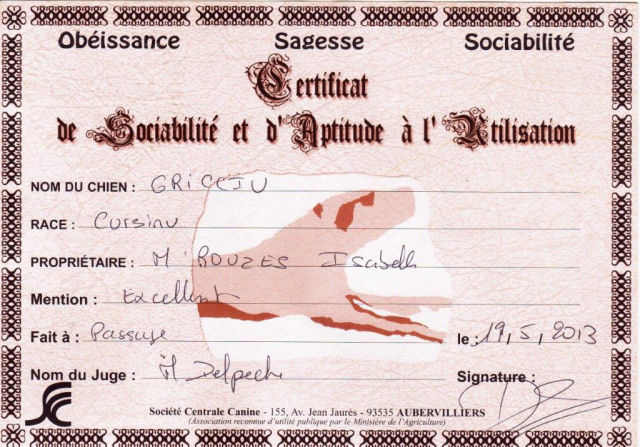 Le Cursinu et le CSAU (certificat de sociabilité et d'aptitude à l'utilisation) Le Cursinu, un chien équilibré sociable et obéissant Chaque jours passé auprès de mon cursinu me fait réaliser à quel point ils sont uniques, intelligents et polyvalents. Pour démontrer une fois de plus la formidable polyvalence de notre race, nous nous sommes préparés pour l'obtention du CSAU, afin de prouver que malgré son caractère fier et méfiant vis à vis des étrangers, le Cursinu est néanmoins un chien équilibré, sociable et obéissant qui sait faire face aux situations nouvelles et s'adapter. Le CSAU est essentiellement passé par des chiens de groupe 1, soit de type berger, soit de type garde d'où mon idée ; après tout le Cursinu excelle dans ces deux domaines alors pourquoi pas nous. Nous avons donc préparé l'examen en candidat libre, travaillant des différentes épreuves demandées, avec une relative facilité, (une fois de plus l'intelligence de ce chien et son attachement à son maitre rend le travail très agréable, il comprend et assimile vite) Son caractère un peu têtu peu parfois être un frein mais avec patience et douceur il écoute. Profitant de la possibilité de présenter l'examen à l'Exposition d'Agen, nous nous sommes inscrits. La majorité des chiens présents étaient des Chiens de Groupe 1 : Bergers blancs suisses, Bergers Allemands, Bergesr Australiens, Beaucerons , Malinois, membres de club d'obéissance, notre performance fut donc remarquée et appréciée puisque Gricciu réalisa un parcours sans faute ce qui lui valu la mention excellent. Une preuve de plus de la polyvalence de notre race et de ses qualités de travail. Isabelle ROUZES ![]()